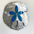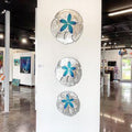 This blue and silver sand dollar is available and ready to ship or pick up at the Swartz Gallery in Pinellas Park. This will be an awesome piece for your home or office. This piece can stand alone or as an addition to your Swartz sea life collection. This sculpture is made of aluminum with an automotive finish so it is perfect for hanging both indoors and outdoors. Bottom sand dollar in photo is 18"