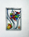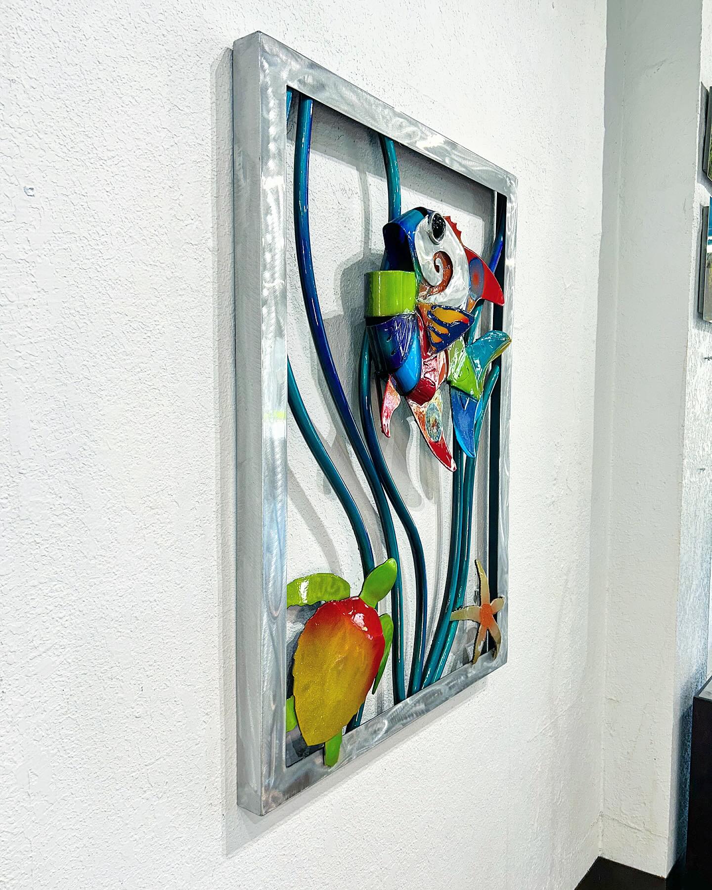 This angelfish and jellyfish framed reef scene sculpture is ready to ship or pick up at the Swartz Gallery in Pinellas Park. This will be an awesome piece for your home or outdoor space. This sculpture is made of aluminum with an automotive finish so it is perfect to display indoors or outdside.