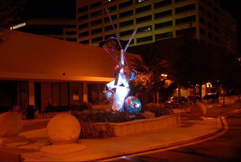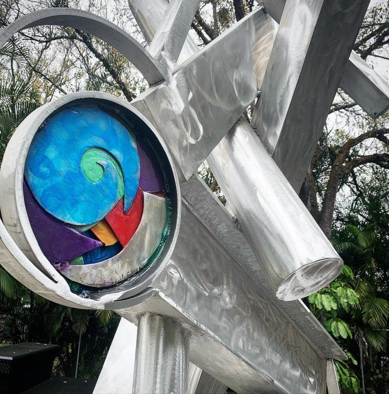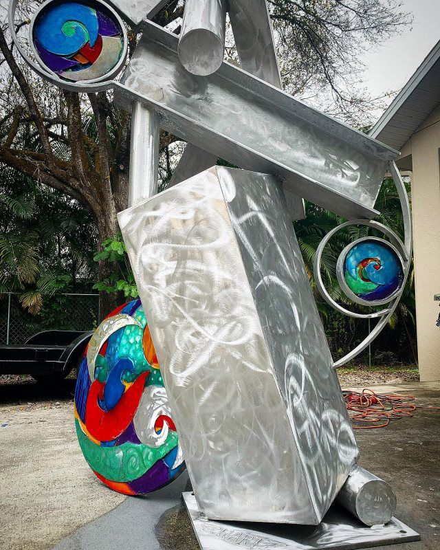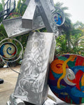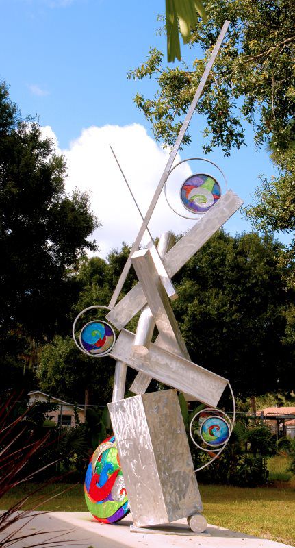 Welded aluminum free-standing sculpture that is painted with an array of saturated and translucent enamel based paints. The sculpture is then skillfully coated with a dupont automotive finish for a long lasting and lustrous shine.