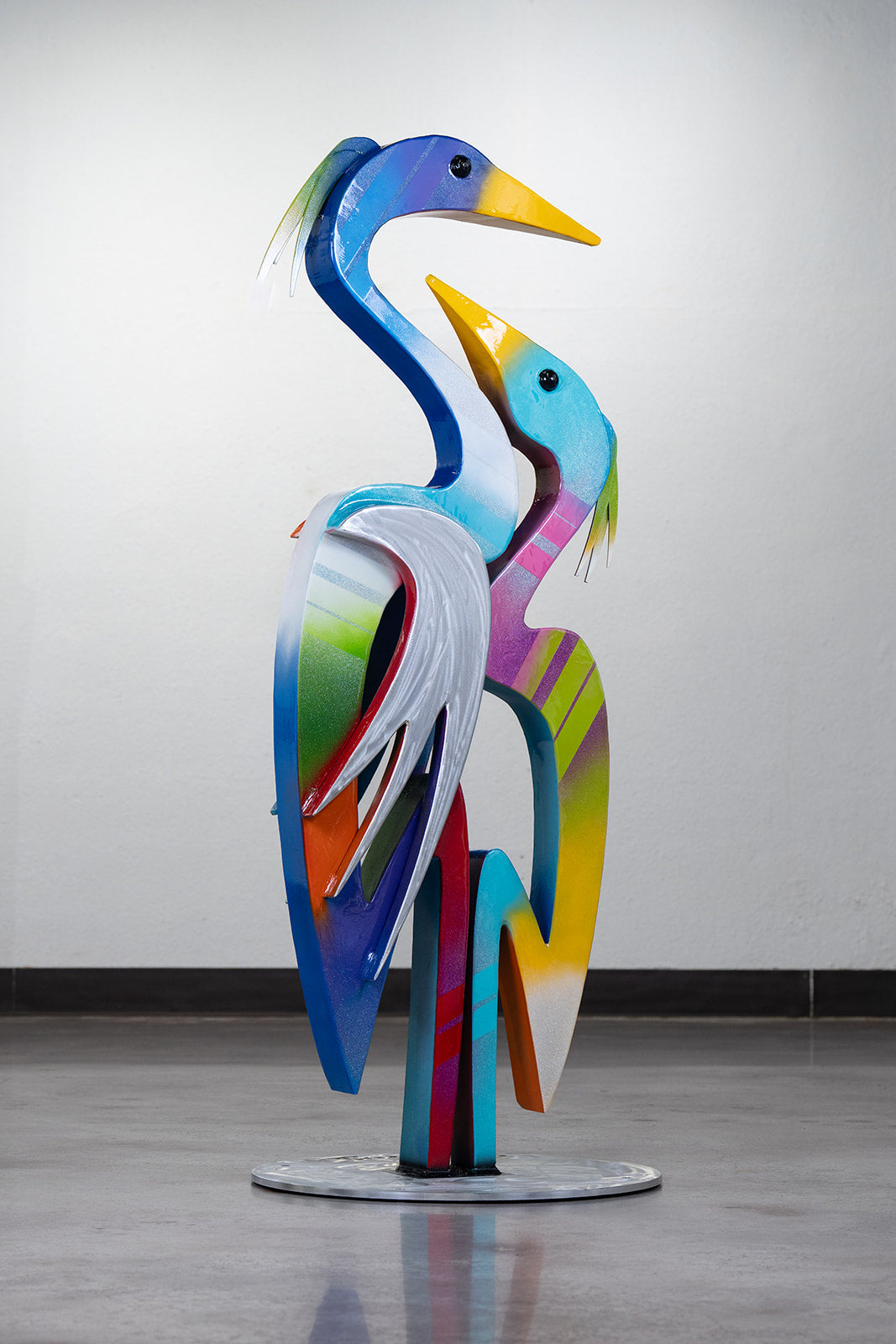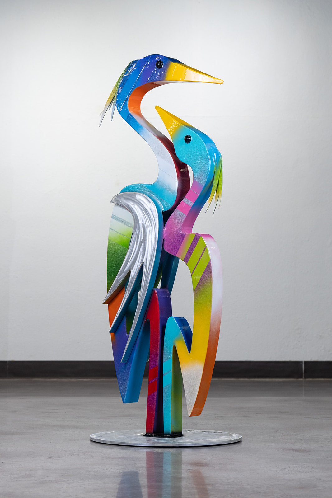 Double Heron Adore is an aluminum sculpture by Clayton Swartz that celebrates connection and elegance through the intertwined forms of two herons. Cast in durable aluminum, this piece combines artistic sophistication with weather-resistant longevity, making it equally striking indoors or in outdoor settings. The fluid lines and graceful composition evoke themes of love, joy, and beauty, while the material's reflective qualities enhance its visual impact across changing light. A distinguished addition to any collection, this work exemplifies Swartz's mastery of sculptural form and his ability to infuse profound emotion into three-dimensional art.