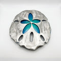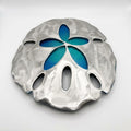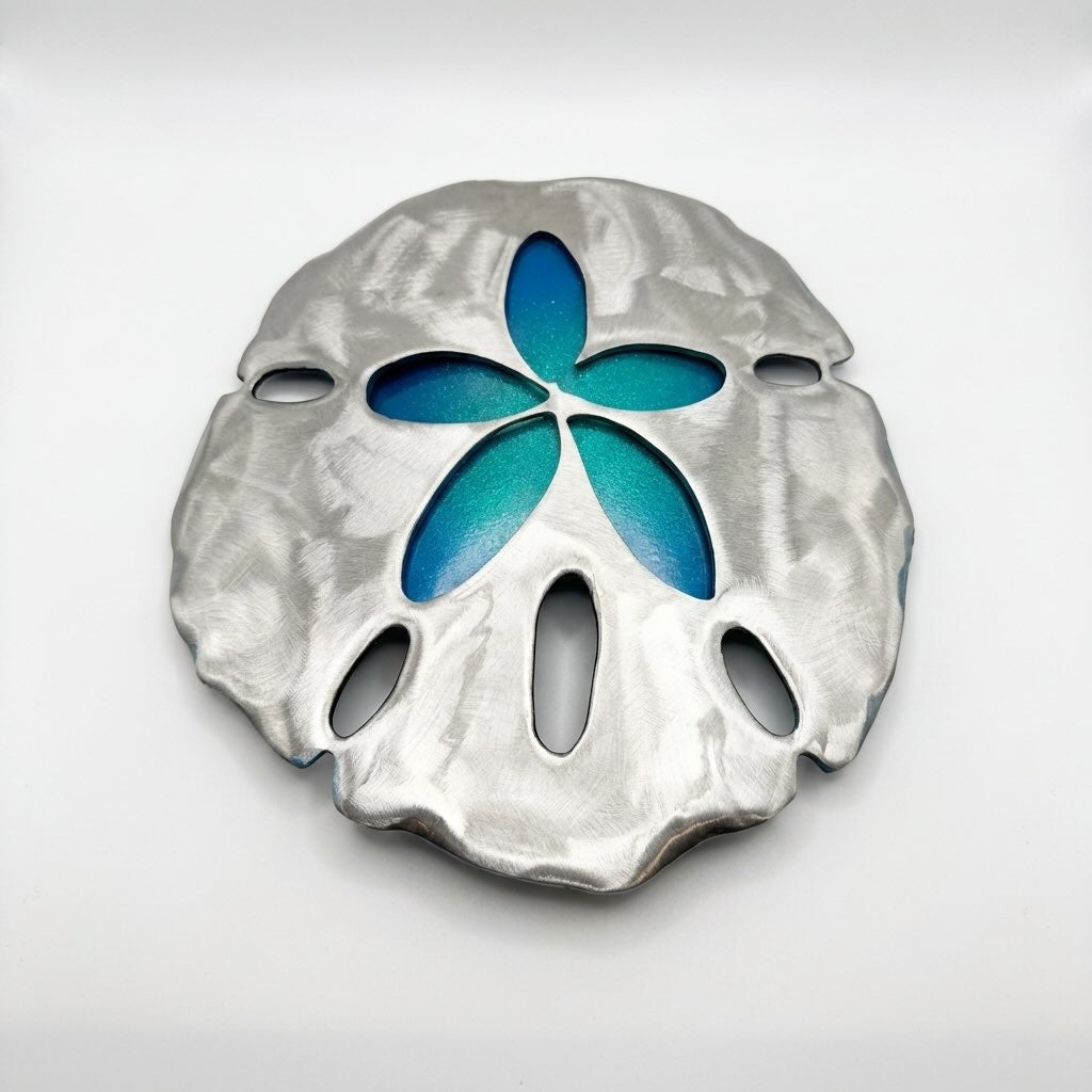 This 30-inch sand dollar sculpture brings coastal elegance to any space. Hand-crafted by Clayton Swartz, it features a striking blue finish with automotive-grade aluminum construction, making it equally at home indoors or displayed outdoors. The sculptural design captures the natural beauty of sea life with modern artistry. Ready to ship or available for pickup at Swartz Gallery in Pinellas Park. Display it as a standalone statement piece or complement your existing sea life collection. A one-of-a-kind addition to your home or office.