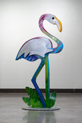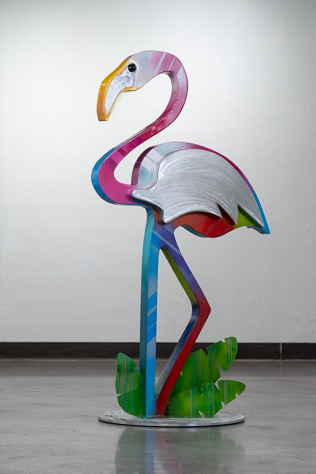 Standing at an impressive 6 feet, this Flamingo sculpture by Clayton Swartz commands attention with its vibrant presence and meticulous craftsmanship. Constructed from aluminum with an automotive-grade finish, the piece showcases brilliant color work that captures the bird's natural radiance while ensuring exceptional durability. The sculptural form pairs beautifully with green foliage, whether positioned as a striking indoor statement piece or as a garden focal point. Swartz's expert handling of form and finish transforms this work into a celebration of beauty and artistic vision, making it an exceptional investment for collectors and design enthusiasts seeking museum-quality sculpture.