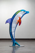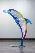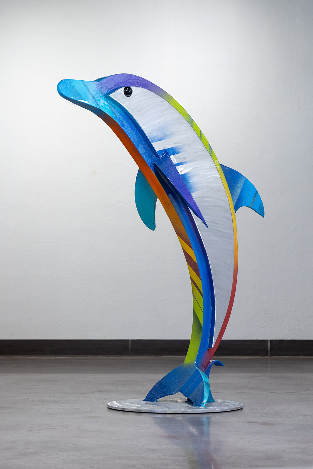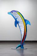 This striking 6-foot freestanding dolphin sculpture brings contemporary artistry to any outdoor space. Crafted by artist Clayton Swartz, it features vibrant modern colors and a professional automotive finish that withstands the elements while maintaining its lustrous appeal. The dynamic form captures the grace and energy of these magnificent marine mammals, making it an ideal focal point for poolside settings, gardens, or outdoor entertaining areas. A sophisticated statement piece that merges fine art with functional outdoor décor.