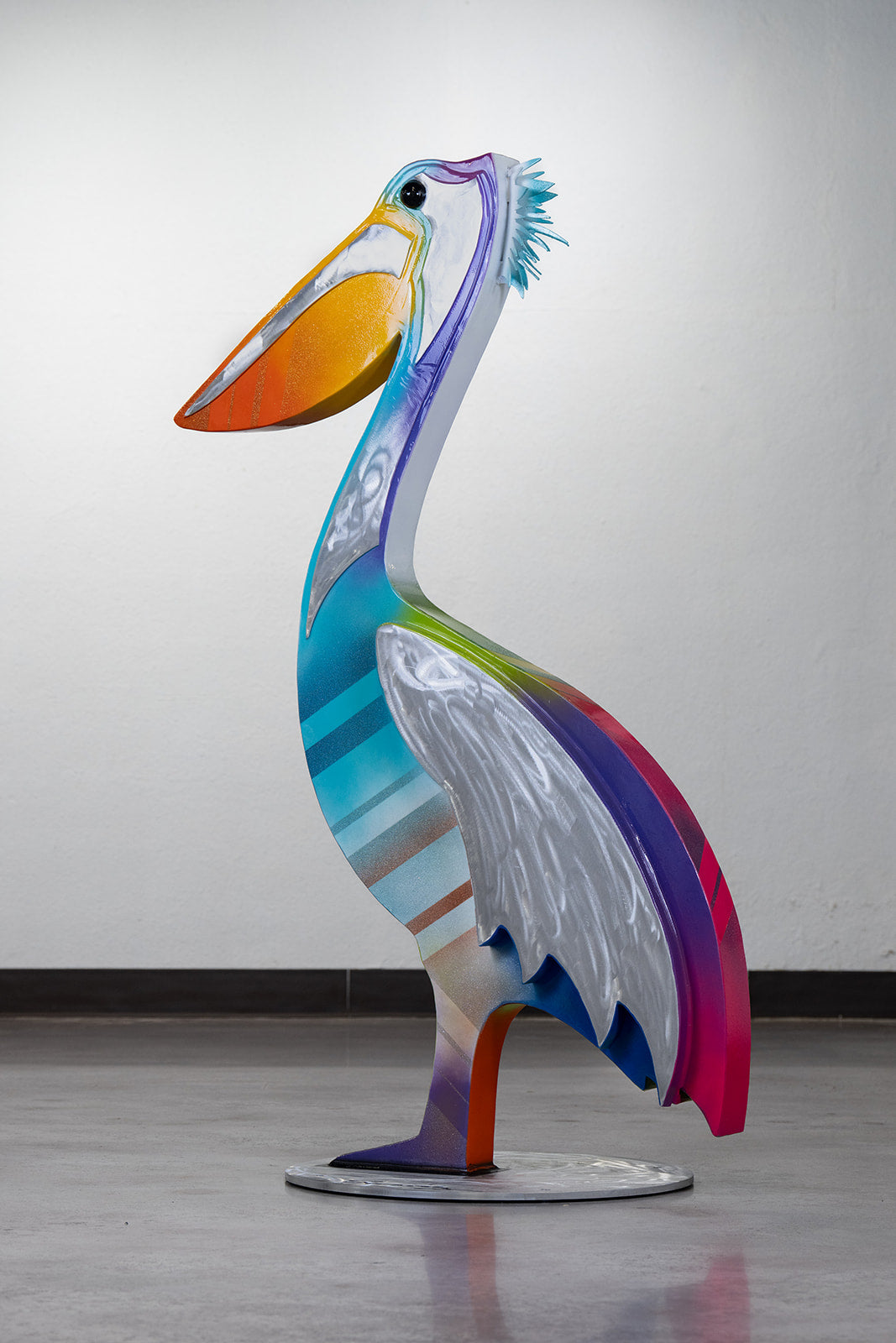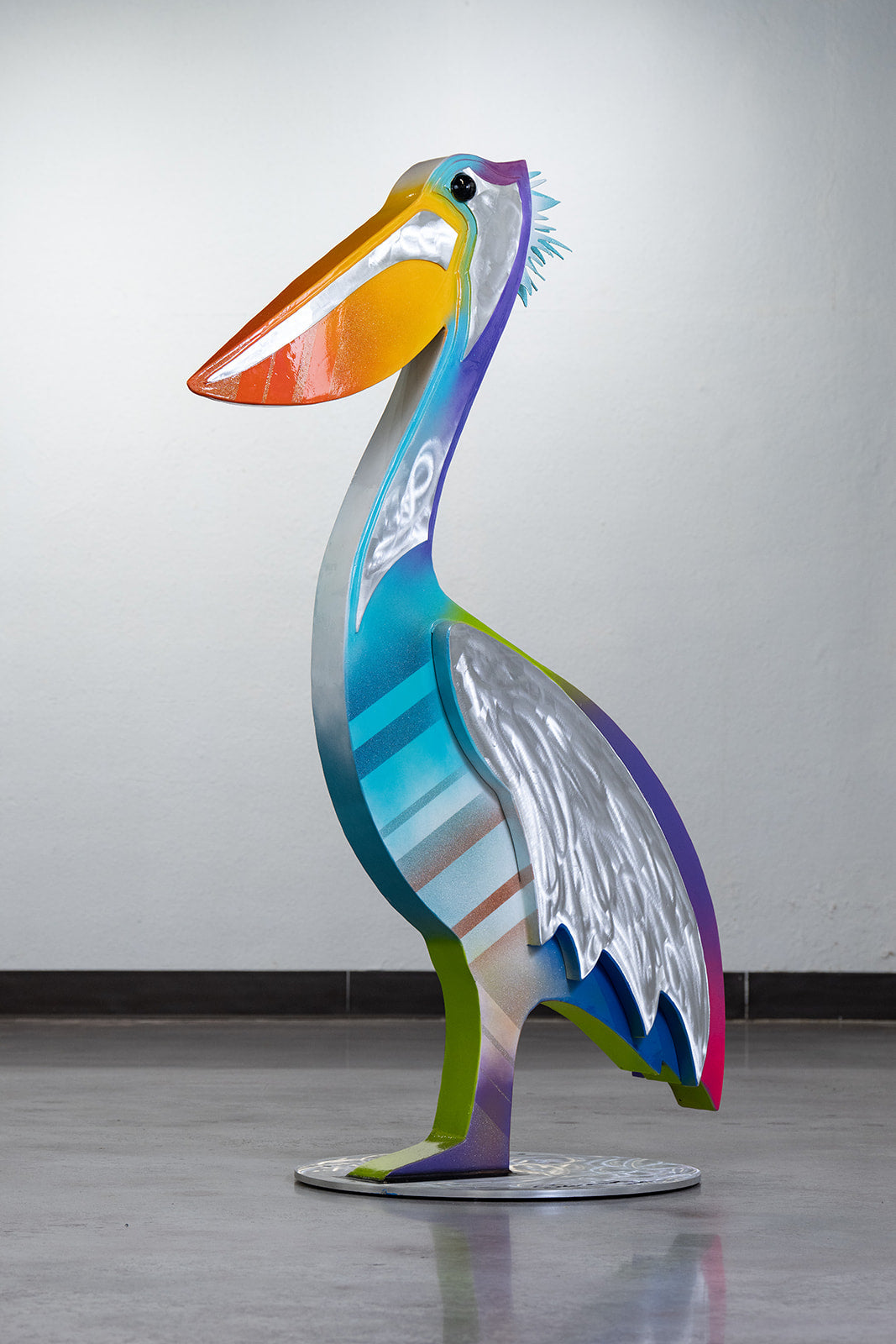 This freestanding Pelican sculpture by Clayton Swartz merges contemporary artistry with functional elegance. Rendered in aluminum with a vibrant automotive finish, the piece maintains its striking appearance whether displayed indoors as a sculptural centerpiece or positioned outdoors in garden or landscape settings. The modern aesthetic and bold color palette reflect Swartz's sophisticated approach to form, creating a dynamic visual presence that commands attention. Built to withstand environmental conditions, this work exemplifies the artist's commitment to creating enduring art that celebrates nature's majesty while enhancing architectural and natural spaces with refined artistic expression.