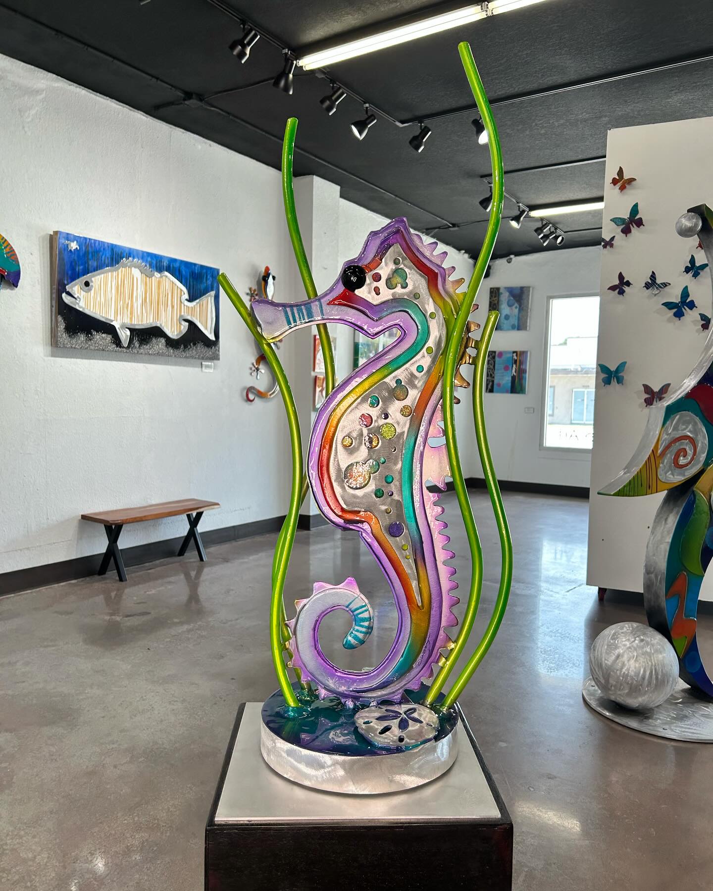 This multicolored seahorse tabletop sculpture by Clayton Swartz captures the vibrant essence of sea life with expert craftsmanship. As an American sculptor and painter, Swartz blends artistic inspiration with detailed form, making this piece a striking addition to both indoor and outdoor spaces. Its vivid colors and dynamic design bring a touch of marine beauty and creativity to any environment.